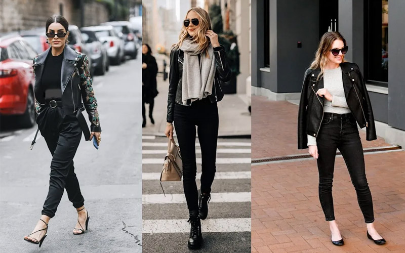 - روی پیراهن مشکی کوتاه یا دامن کوتاه، کت چرمی ظاهری جسورانه و مدرن ایجاد میکند.