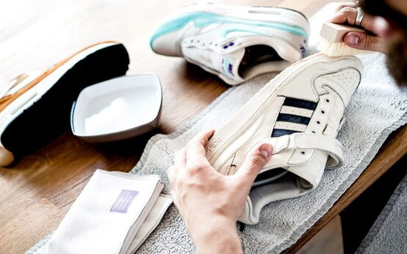 - اگر کتونی شما چرمی است، میتوانید از محلول شوینده مخصوص چرم یا ترکیب آب ولرم و چند قطره مایع شوینده ملایم استفاده کنید و سپس با حوله خشک پاک کنید تا رد آب باقی نماند.