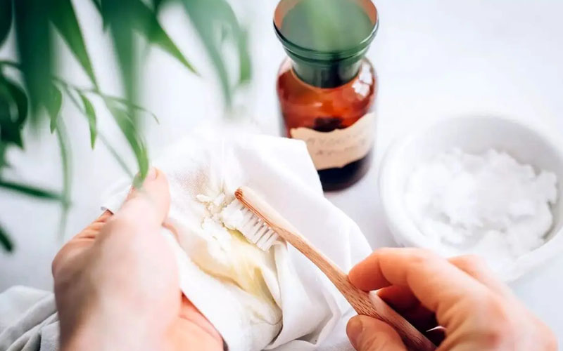 - محلول را روی لکه بریزید و با مسواک نرم کمی روی آن بمالید.