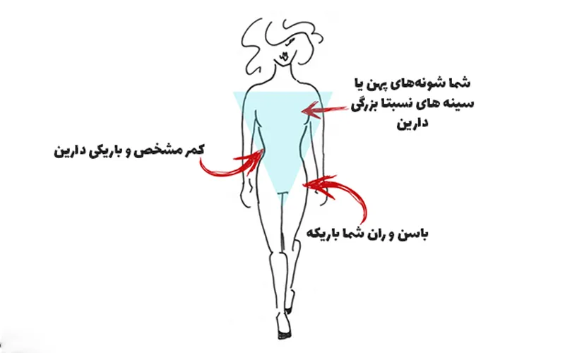 اگر بالاتنه شما پهنتر از پایینتنه است و دور کمرتان باریک است، فرم بدن شما مثلثی معکوس نام دارد. در این حالت شانهها و سینهها برجستهتر هستند و باسن نسبتا کوچک به نظر میرسد. هدف اصلی در انتخاب لباس برای این فرم بدن، ایجاد تعادل بین بالا و پایین بدن است تا نگاهها به سمت پایینتنه کشیده شود و استایل شما طبیعی و زیبا به نظر برسد.