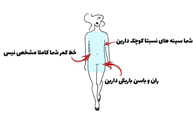 اگر فرم بدن شما مستطیلی است، یعنی دور کمر، سینه و باسن تقریبا هماندازه و در یک راستا هستند. در این حالت بدن شما فرم صاف یا موزی شکل دارد و برجستگی زیادی در قسمتهای مختلف بدن دیده نمیشود. نکته مهم برای این فرم بدن، ایجاد انحنا و جلب توجه به نقاطی است که میتواند ظاهری جذابتر و متناسبتر بسازد.